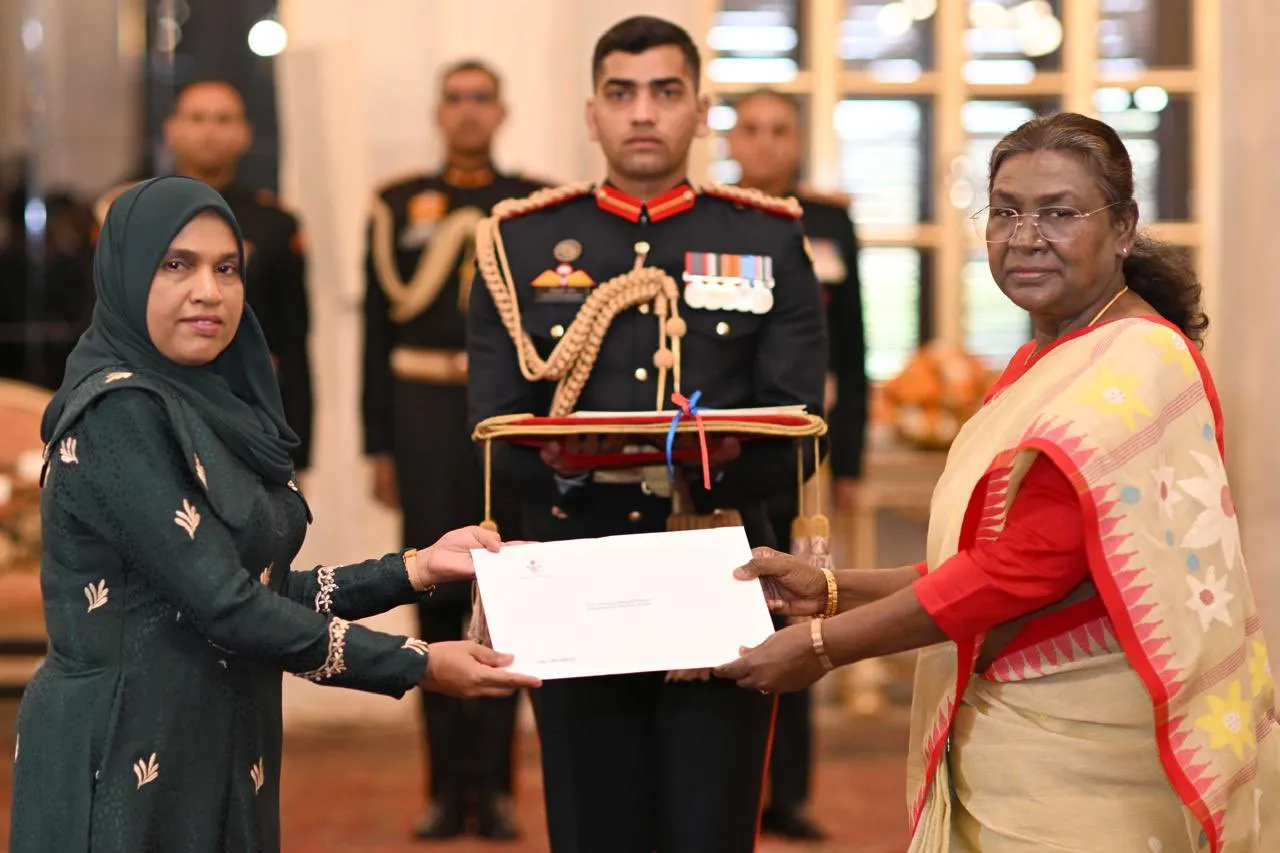 ދިވެހިރާއްޖެއިން އިންޑިއާއަށް ކަނޑައެޅުއްވި އައު ސަފީރު، އަލްފާޟިލާ އައިޝަތު އަޒީމާ އެކަމަނާގެ ސަފީރު ކަމުގެ ފަތްކޮޅު އިންޑިއާގެ ރައީސާ ދުރުޕަތީ މުރުމުއަށް މިއަދު އަރުވައިފިއެވެ. ސަފީރުކަމުގެ ފަތްކޮޅު އެރުވުމުގެ ރަސްމިއްޔާތު އޮތީ މިއަދު މެންދުރު ނިއުދިއްލީގައި ރިޔާސީ ގަނޑުވަރު "ރާސްތްރަޕަތީ ބަވަން" ގައި އެކަމަށް ބޭއްވި ޚާއްސަ ރަސްމިއްޔާތެއްގައެވެ.