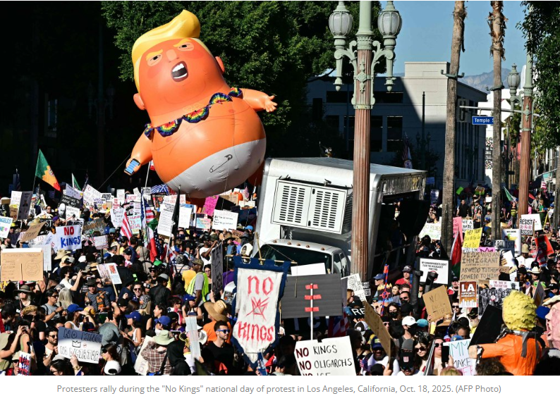 މިއަދު ޓްރަމްޕުގެ ބޮޑާކަމާއި އަބުއި ކަމާ ދެކޮޅަށް އެމެރިކާގެ 50 ސްޓޭޓުގައި މީހުން ނިކުމެ ޓްރަމްޕްގެ ސިޔާސަތުތަކާ ދެކޮޅަށް "ނޯ ކިންގްސް" ގެނަމުން މުޒާހަރާތައް ކުރިއަށްދިޔައެވެ. މުޒާހަރާގެ އިންތިޒާމު ކުރި ފަރާތްތަކުން ބުނާ ގޮތުގައި ނިއުޔޯކުން ފެށިގެން ލޮސް އެންޖެލަސް އަށް 7 މިލިއަން މީހުން ވަނީ މުޒާހަރާގައި ބައިވެރިވެފައެވެ. އަދި ކުދި ސިޓީތަކާއި ޓްރަމްޕްގެ ގެއާ ކައިރި ސަރަހައްދުތަކުގައިވެސް މުޒާހަރާތައް ބޭއްވުނެވެ.