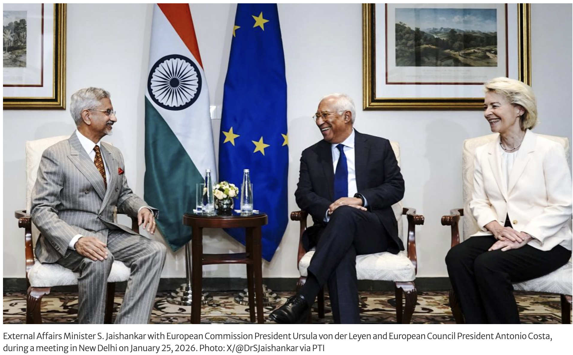 އިންޑިއާގެ 77 ވަނަ ޖުމްހޫރީ ދުވަހުގެ ރަސްމީ މެހެމާނުންގެ ގޮތުގައި އިންޑިއާއަށް ވަޑައިގެން އުޅުއްވާ ޔޫރަޕިއަން ކައުންސިލްގެ ރައީސް އެންޓޯނިއޯ ކޮސްޓާ އަދި ޔޫރަޕިއަން ކޮމިޝަންގެ ރައީސް އުރުސުލާ ފޮން ޑަ ލޭޔަންއާ އިންޑިއާގެ އެކްސްޓާނަލް އެފެއާޒް މިނިސްޓަރު އެސް. ޖައިޝަންކަރު ނިއުދިއްލީގައި ބައްދަލުކުރައްވައިފިއެވެ.
